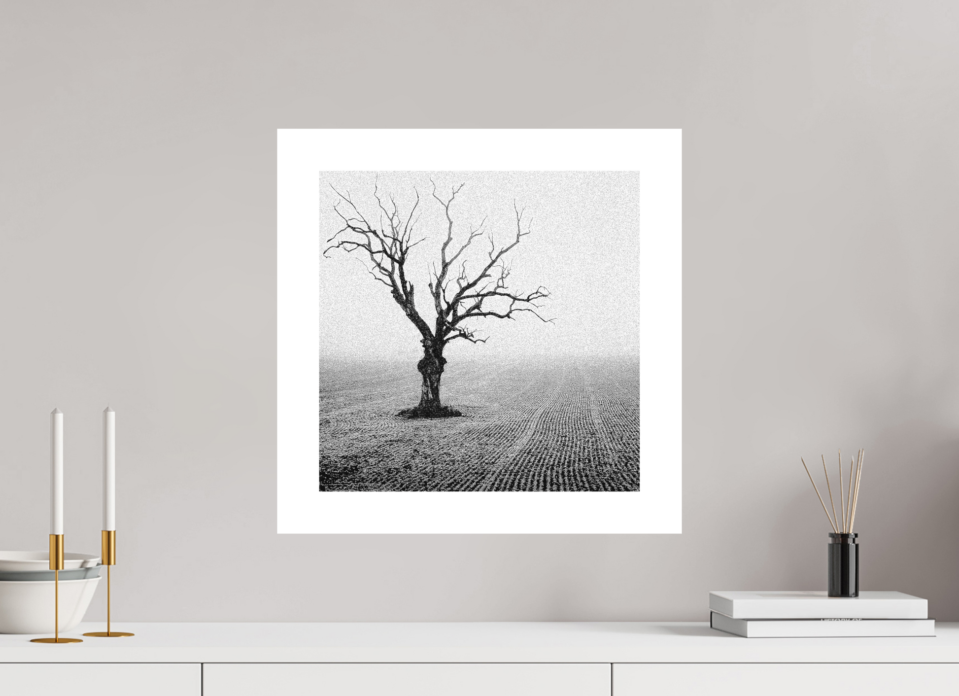 The tree, devoid of leaves stripped by age, becomes a symbol of endurance and finality - a monument slowly yielding to time. Ken's decision to place the subject forward center-left gives the composition a sense of solemn symmetry, while the vastness of the surrounding field amplifies its solitude. The high-grain texture adds a tactile density to the scene, referencing the aesthetics of vintage film and giving the image a timeless, almost etching-like quality.