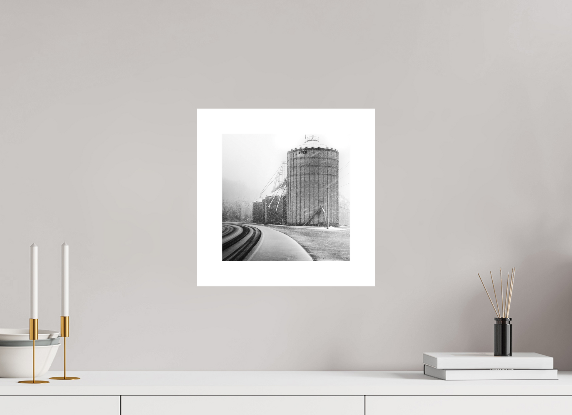 What’s particularly compelling is how Evans juxtaposes the severe verticality of the silos with the soft serpentine curve of the road. This compositional rhythm not only draws the eye through the image but suggests movement through both space and season. There is a subtle narrative here: a quiet moment in rural necessity paused by winter's grip, preserved in silvered tones and subtle texture.
