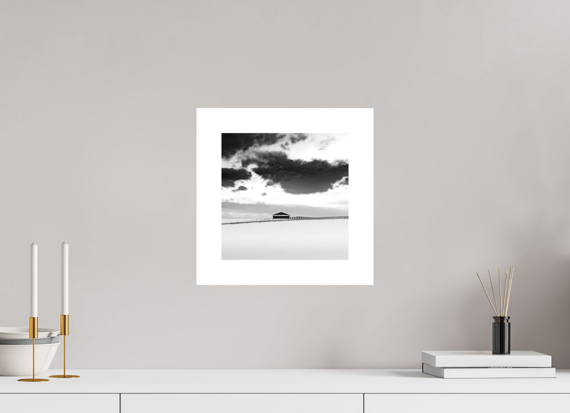 Minimal Farm 1 inaugurates Ken Evans' quiet, contemplative series on rural architecture and landscape reductionism. In this foundational piece, Evans distills the rural American vernacular into a meditation on scale, silence, and spatial isolation. The lone barn sits squarely on the horizon, caught between the vast negative space of a snow-covered foreground and an expressive, darkening sky. Evans’ restrained framing and tonal discipline convert an otherwise familiar scene into something almost spiritual in its sparseness.