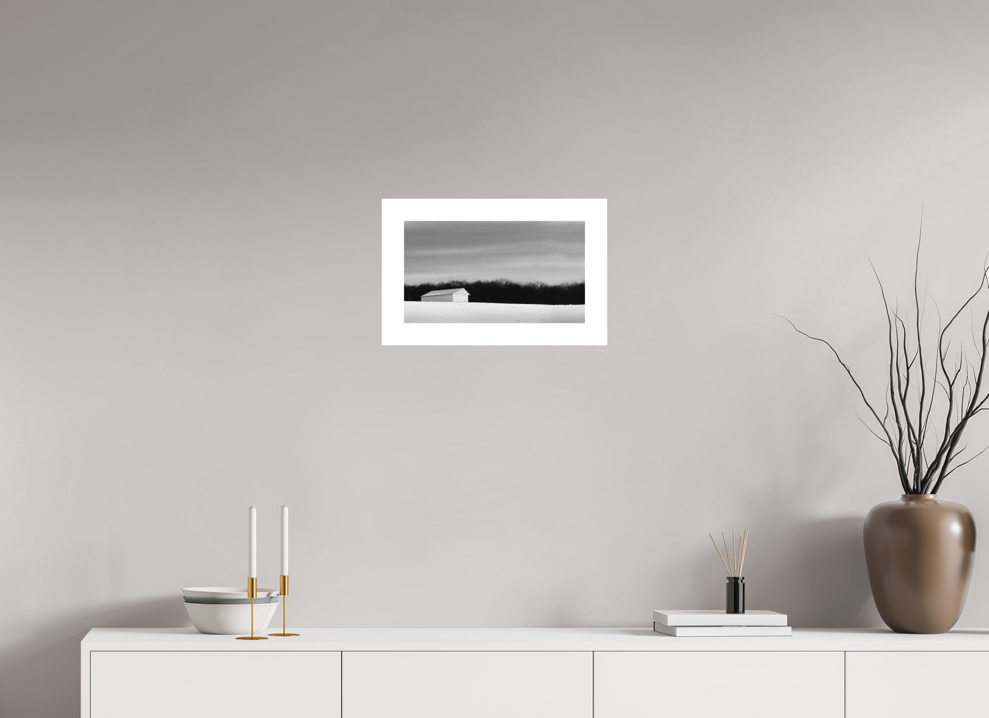 This is a composition of restraint - a photograph that finds its emotional power through simplicity and spatial isolation. The small white outbuilding, nearly swallowed by a vast field of snow and an expansive sky, becomes a quiet focal point. The structure’s near-geometric precision contrasts elegantly with the organic line of the tree line and the soft grain of the sky, enhancing a sense of existential calm and isolation.