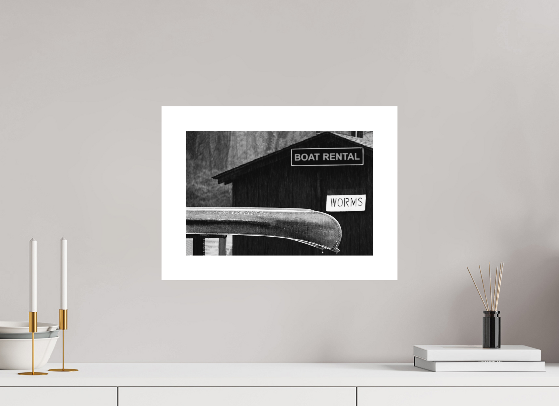 The composition is grounded by the elongated curve of the canoe hulls in the lower register of the frame, whose riveted texture and bruised skin recall industrial still life studies akin to Walker Evans or even Robert Frank. But the tension here comes from the dry irony of the stacked signage: “BOAT RENTAL” hovering in authoritative sans serif, while the hand stenciled “WORMS” below feels almost like a punchline - or a meditation on the necessities of outdoor recreation.