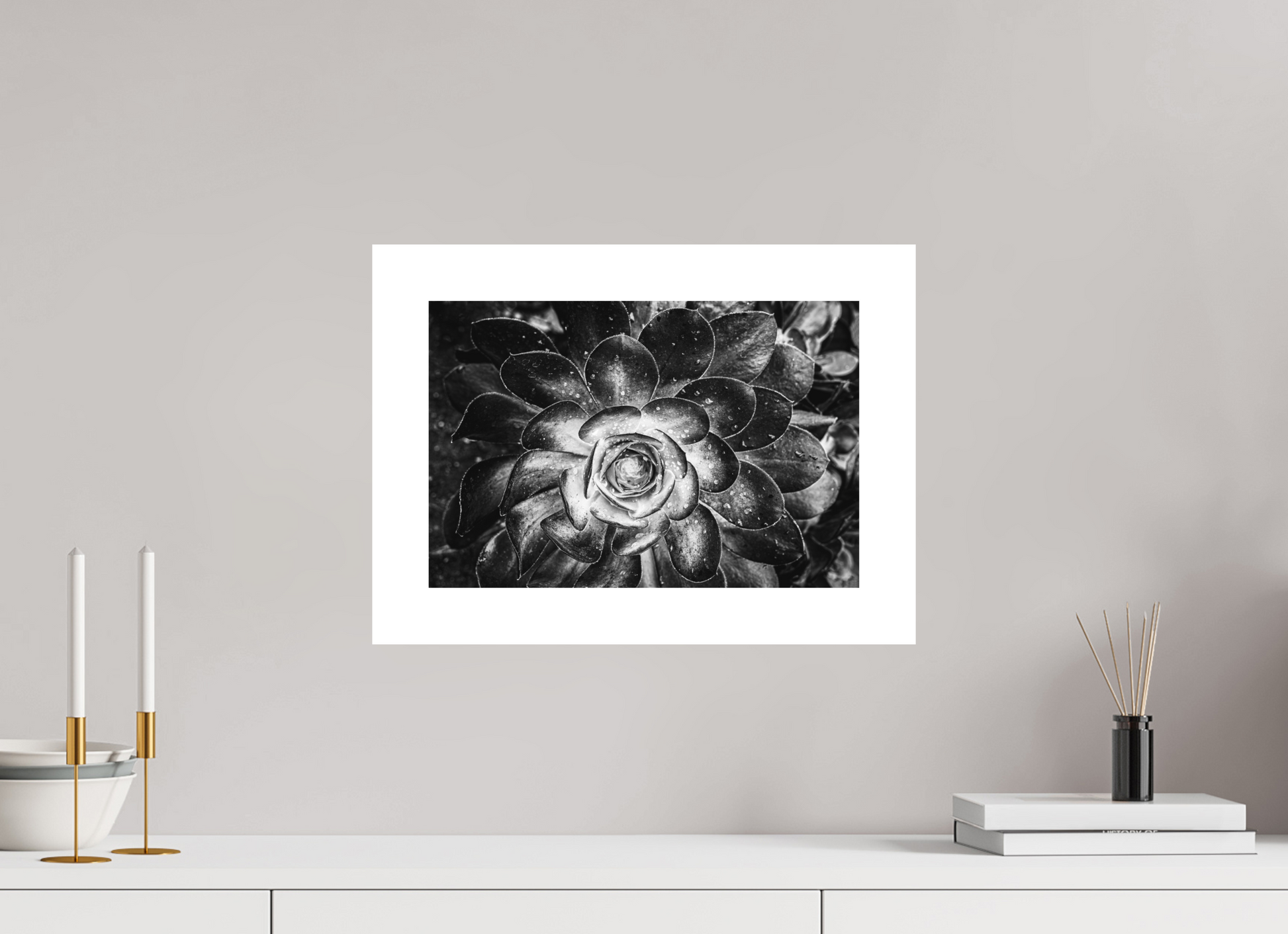 In Santa Monica No. 29, Ken Evans turns his lens to a common succulent - a constant presence in Southern California landscapes - but renders it with uncommon reverence and precision. This macro photograph, composed in striking monochrome, elevates the botanical subject to something almost architectural. The tightly framed composition draws the viewer directly into the spiral symmetry of the plant, recalling sacred geometries and the natural patterns of growth and renewal. Evans' choice to work in black and white - consistent with the entire Santa Monica series - strips the scene of any visual cliché often associated with floral photography. Instead of color, he relies on tonal contrast, edge clarity, and surface texture to communicate mood. The light appears soft and diffused, possibly taken under overcast skies or controlled conditions, accentuating the subtle water droplets on each fleshy leaf. These droplets serve not only as detail but as punctuation, lending a tactile intimacy to the image. Technically, the image is impeccable. The clarity of the central whorl is balanced by the gentle fall-off of focus toward the edges, guiding the eye inward. Evans uses the succulent's radial structure to orchestrate a quiet sense of motion, almost hypnotic in effect. The print offers an invitation - not just to look at a plant, but to meditate on its form. Santa Monica No. 29 works as both a stand-alone piece and a textural counterpoint within the broader series. While other works in the collection often emphasize abstraction or surreal scale, this image leans into formalism, offering a moment of stillness and contemplation. This piece would complement a modern, minimal interior, especially in spaces that benefit from organic structure and visual rhythm. It’s particularly well-suited to people interested in the convergence of fine art photography and natural form studies. This print is carefully crafted to ensure the highest quality and detail, bringing the image to life in your hands and on your walls. Printed on Hahnemühle Fine Art paper. Perfect for art enthusiasts, collectors, or simply to add a touch of elegance to your space that will last for generations