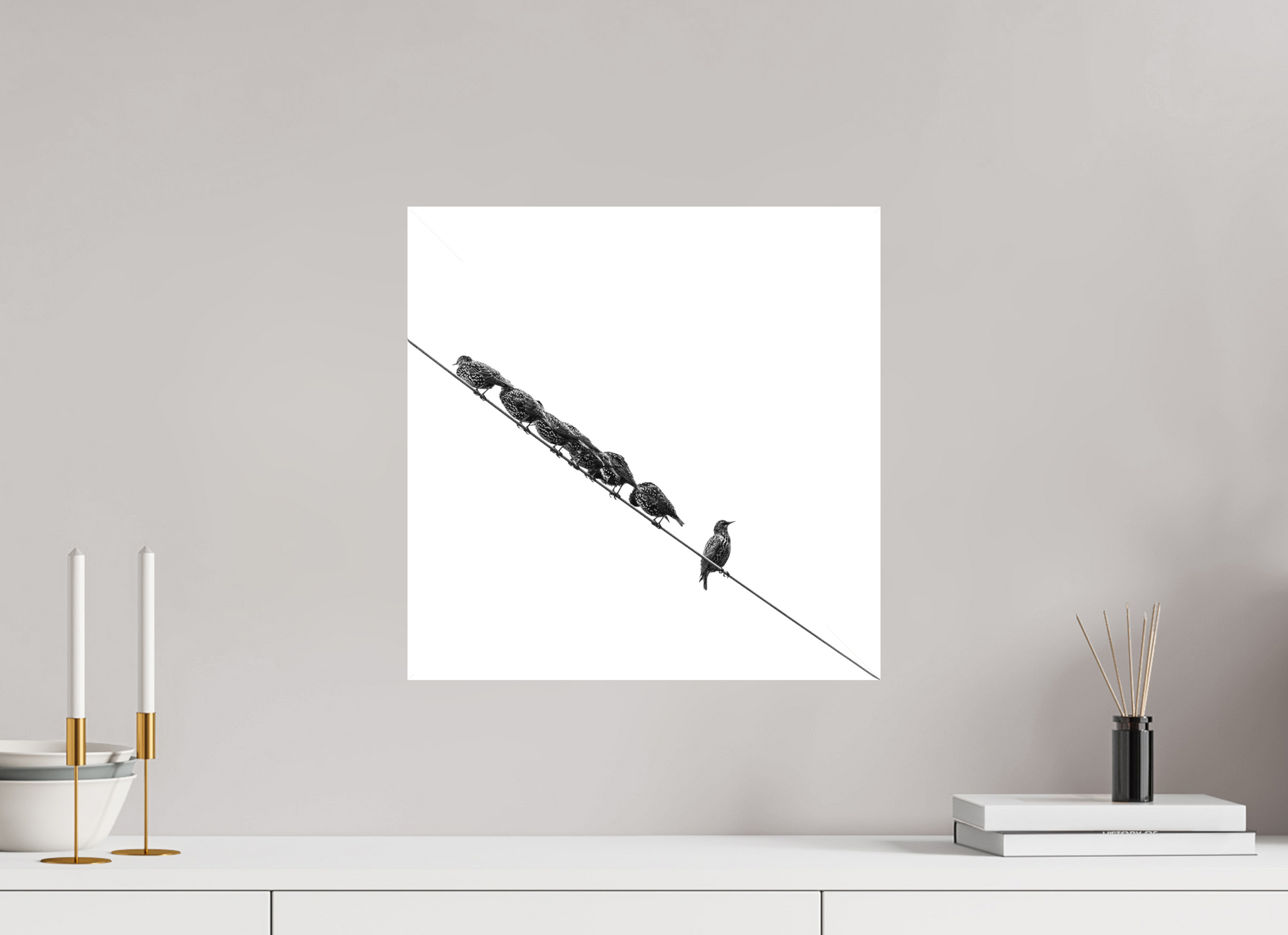 Evans works in a visual vernacular that recalls Minimalist and Constructivist traditions, particularly the stark contrast and spatial rigor of artists like Ellsworth Kelly or Alexander Rodchenko. The white expanse of negative space becomes an active field, emphasizing the precarious tension between unity and independence. The diagonal wire slices the frame with graphic decisiveness, functioning almost as a minimalist slash - a modernist gesture upon which the birds become punctuating glyphs.