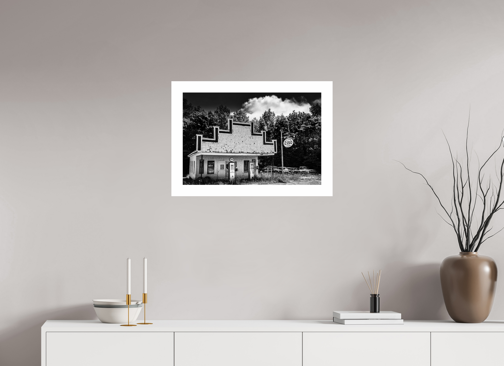 In Speed Trapped, Ken Evans captures a striking moment of mid-century Americana, rendered in rich black and white tones that amplify both the nostalgia and the quiet decay of roadside life. This once-bustling Esso gas station stands weathered but proud, its tiered gable roof and peeling shingles hinting at decades of service long since passed. Beneath the faded sign, a lineup of vintage cars settles into the background—silent witnesses to the passage of time.